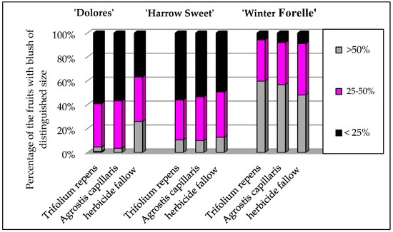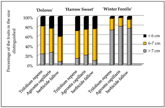 In both LM variants tested, a higher percentage of large fruit (over 7 cm in diameter) was recorded, but in relation to the control, these differences were not statistically significant (Figure 2). In the presence of mulch, the percentage of the smallest fruit (less than 6 cm in diameter) was significantly lower than in the herbicide-treated fallow in the case of two varieties—‘Dolores’ and ‘Winter Forelle’. Similar results were reported by Baluszynska et al. [6] for apple cv ‘Sampion’ growing in Festuca ovina mulch. Stern and Doron [38] pointed out that the size of pear fruit was a critical market factor, as consumers prefer large fruit. Therefore, the lower share of ultra-fine fruit found in the LMs compared to the control should be considered an advantage of this method of orchard floor management.