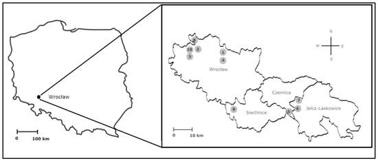 This research was conducted in Lower Silesia, located in the southwestern part of Poland (Figure 1). This region has a moderate climate dominated by an oceanic influence. The mean annual air temperature is simply 8 °C, with warm summers (mean of 18 °C in July), mild winters (mean of −1.4 °C in January), and an annual precipitation of about 550 mm [41]. Due to the economic conditions and high fragmentation of farms, fallow land makes up a high proportion of the agricultural landscape of the study region. Ten fallows (study sites), each with an area of about 2000 m2, were chosen for this study. The main criteria for the selection of fallow land were at least a 10-year period of abandonment from agricultural use and the presence of self-seeded black cherry plants in the mature (blooming) stage. The primary propagule sources of the invader were forests, mid-field shelterbelts, and home gardens adjacent to the selected agricultural lands. The selected sites represented different types of soil (Table 1). These data were obtained from publicly available cadastral maps for the region [42]. Soils were classified according to the Polish Soil Classification [43] and the World Reference Base (WRB) classification [44]. For each soil, based on both classifications, the soil type was the same.
