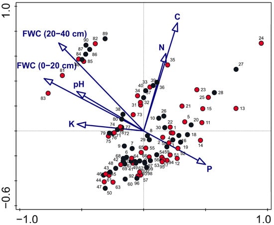 Canonical correspondence analysis (CCA) diagram for the studied plots and soil variables, represented as vectors in the ordination space. Plots with Padus serotina are marked as red points, and plots without this species are marked as black points. Numbers of plots are as described in Table 1. Designations of soil variables are given in the description of Table 2.