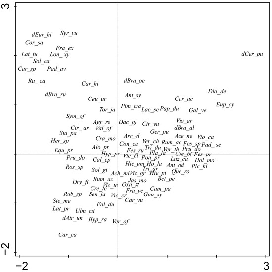 Canonical correspondence analysis (CCA) diagram for the species of the herb and moss layer. The letter “d” before the abbreviation denotes moss species. Species names and abbreviations: Ace_ne—Acer negundo, Ach_mi—Achillea millefolium, Agr_re—Agropyron repens, Alo_pr—Alopecurus pratensis, Ant_od—Anthoxanthum odoratum, Ant_sy—Anthriscus sylvestris, Arr_el—Arrhenatherum elatius, dAtr_un—Atrichum undulatum, Bet_pe—Betula pendula, dBra_al—Brachythecium albicans, dBra_oe—Brachythecium oedipodium, dBra_ru—Brachythecium rutabulum, Cal_ep—Calamagrostis epigejos, Cam_pa—Campanula patula, Car_sp—Cardaminopsis sp., Car_ac—Carduus acanthoides, Car_hi—Carex hirta, Car_vu—Carlina vulgaris, Car_ca—Carum carvi, dCer_pu—Ceratodon purpureus, Cir_ ar—Cirsium arvense, Cir_vu—Cirsium vulgare, Con_ca—Conyza canadensis, Cor_sa—Cornus sanguinea, Cra_mo—Crataegus monogyna, Cre_bi—Crepis biennis, Cre_te—Crepis tectorum, Dac_gl—Dactylis glomerata, Dia_de—Dianthus deltoides, Dry_fi—Dryopteris filix–mas, Equ_pr—Equisetum pratense, Eup_cy—Euphorbia cyparissias, dEur_hi—Eurhynchium hians, Fal_du—Fallopia dumetorum, Fes_pr—Festuca pratensis, Fes_ru—Festuca rubra, Fes_sp—Festuca sp., Fra_ve—Fragaria vesca, Fra_ex—Fraxinus excelsior, Gal_ve—Galium verum, Ger_pu—Geranium pusillum, Geu_ur—Geum urbanum, Gna_sy—Gnaphalium sylvaticum, Her_sp—Heracleum sphondylium, Hie_pi—Hieracium pilosella, Hie_um—Hieracium umbellatum, Ho_la—Holcus lanatus, Hol_mo—Holcus mollis, Hyp_pe—Hypericum perforatum, Hyp_ra—Hypochoeris radicata, Jas_mo—Jasione montana, Lac_se—Lactuca serriola, Lat_pr—Lathyrus pratensis, Lat_tu—Lathyrus tuberosus, Lon_xy—Lonicera xylosteum, Luz_ca—Luzula campestris, Oxa_st—Oxalis stricta, Pad_av—Padus avium, Pad_se—Padus serotina, Pap_du—Papaver dubium, Pic_hi—Picris hieracioides, Pim_ma—Pimpinella major, Pla_la—Plantago lanceolata, Poa_pr—Poa pratensis, Pru_do—Prunus domestica, Pru_do_s—Prunus domestica subsp. syriaca, Que_ro—Quercus robur, Ros_sp—Rosa sp., Ru_ca—Rubus caesius, Rub_sp—Rubus sp., Rum_ac—Rumex acetosa, Sen_ja—Senecio jacobaea, Sol_ca—Solidago canadensis, Sol_gi—Solidago gigantea, Sta_pa—Stachys palustris, Ste_me—Stellaria media, Sym_of—Symphytum officinale, Syr_vu—Syringa vulgaris, Tor_ja—Torilis japonica, Tri_ar—Trifolium arvense, Tri_du—Trifolium dubium, Ulm_mi—Ulmus minor, Val_of—Valeriana officinalis, Ver_th—Verbascum thapsus, Ver_ch—Veronica chamaedrys, Ver_of—Veronica officinalis, Vic_cr—Vicia cracca, Vic_gr—Vicia grandiflora.