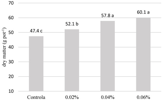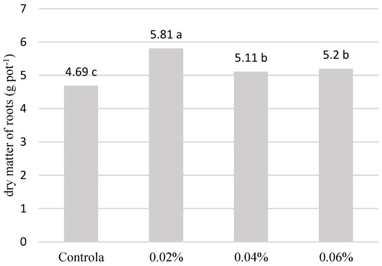 The results (Figure 1) indicated that Tytanit foliar application significantly affected Festulolium braunii (K. Richt.) A. Camus dry matter production. The highest value, on average 24.2% higher than for control units, was recorded for plants treated with 0.04 and 0.06% stimulant concentrations. Compared to the control, the concentration of 0.02% also resulted in a statistically significant increase of 9.91%. The highest amounts of root dry matter (Figure 2) were recorded in plants treated with the lowest concentration of Tytanit, i.e., 0.02%. In response to this amount, dry matter production was on average 12.8% higher than that in units with higher Tytanit concentrations and 23.8% higher than in control units.