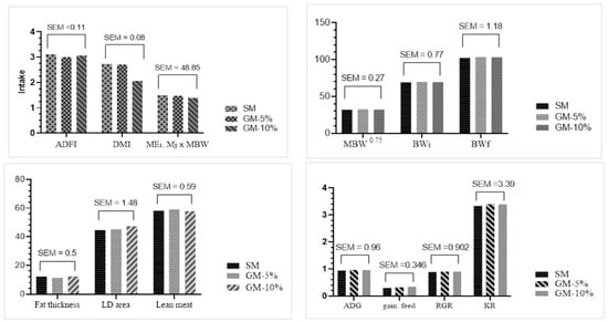 Irrespective of the GM inclusion level, the carcass traits and growth performance were not significantly affected (Figure 1).
