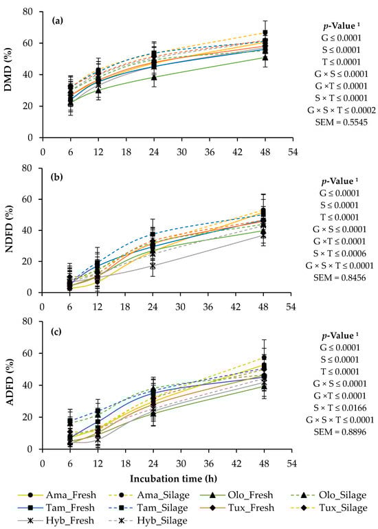 In vitro rumen degradability of dry matter (DMD); (a), neutral detergent fiber (NDFD); (b) and acid detergent fiber (ADFD); (c) of the fresh and ensiled forage of four genotypes of native maize (Zea mays L.) from Mexico and a commercial hybrid, at 6, 12, 24 and 48 h of incubation. 1 G: genotypes of maize; S: states of the forage; T: incubation time; G × S: interaction between genotypes of maize and states of forage; G × T: interaction between genotypes of maize and incubation time; S × T: interaction between states of the forage and incubation time; G × S × T: interaction genotypes of maize, states of the forage and incubation time; SEM: standard error of the mean.