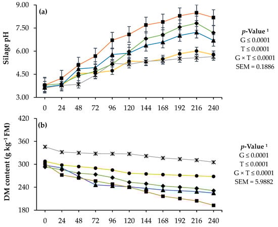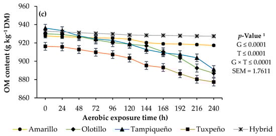 pH (a) and dry matter (DM); (b) and organic matter (OM); (c) content of the ensiled forage of four genotypes of native maize (Zea mays L.) from Mexico and a commercial hybrid, at different times of aerobic exposure. 1 G: genotypes of maize; T: aerobic exposure time; G × T: interaction between genotypes of maize and aerobic exposure time; SEM: standard error of the mean.