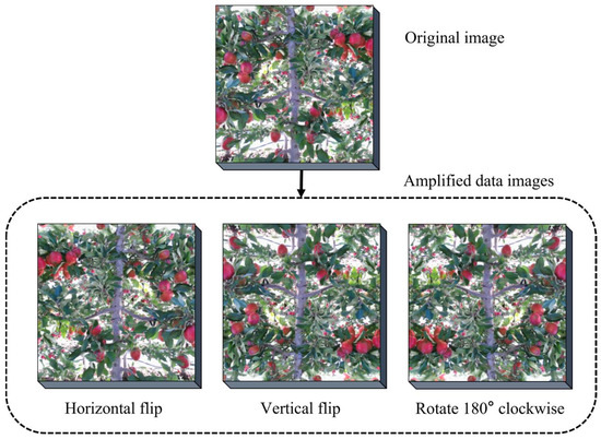 Initially, we captured 300 high-resolution images of apple fruits using a drone. In order to optimize our dataset for training purposes, we applied various transformations to each raw image. These transformations included horizontal flips, vertical flips, and clockwise rotations of 180 degrees. To achieve these transformations, we utilized our Python scripts in conjunction with the Pillow library, an open source computer vision library. In addition to the original images, we also included a schematic diagram, as presented in Figure 3, which further enriched our dataset. Furthermore, to ensure uniformity, each image was resized to a fixed size of 640 pixels × 640 pixels. By employing our data enhancement method, we expanded our dataset from the original 300 images to a total of 900 images. To train our YOLOv5s model, the dataset was divided as follows: 80% of the images (720 images) were allocated for training, 20% (180 images) were assigned for validation to fine-tune the model’s parameters and prevent overfitting, and the initial 40 images acquired were reserved for testing to evaluate the model’s final performance. This careful division allowed for a fair assessment of the model’s performance and effectiveness, ensuring its robustness in real-life scenarios.