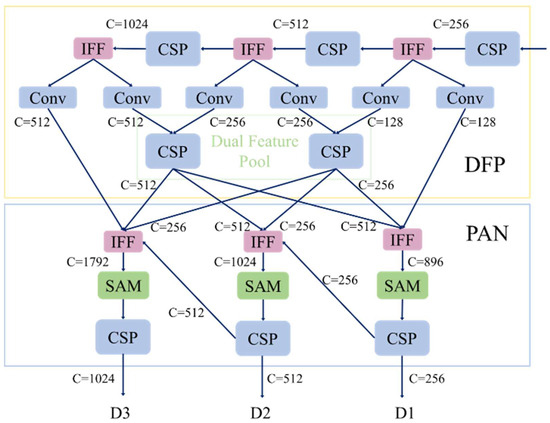 The detection of fruits on apple trees necessitates attention to detailed features. Small-sized fruits only occupy a tiny area of an image; therefore, details such as texture, color, and shape are crucial for distinguishing fruits. However, the high subsampling rate of the YOLOv5 model can easily lead to blurring or information loss of small fruits, affecting detection accuracy. To address this issue, we introduced a Dual-Feature Pooling (DFP) structure to enhance the model’s capability of detecting small objects, as shown in Figure 6.