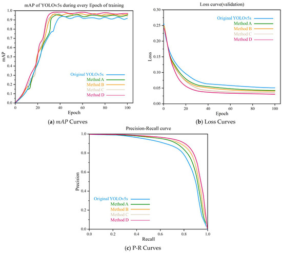To visually demonstrate the effectiveness of the proposed improved method, the original training results for YOLOv5s and the training results for each method are presented. Figure 7 shows a comparison between the proposed improved methods and the original method. In observing Figure 7a, it is clear that the mAP value of the proposed improved methods for the self-collected dataset was significantly higher than that of YOLOv5s. Further comparative analysis revealed that the proposed improved methods converged faster in terms of mAP, with Method D showing the most significant advantage. These results further validate the excellent performance of Method D in the object detection task. Figure 7b shows that Method D exhibited a faster convergence rate during training. With an increasing number of training epochs, it can efficiently learn the features and patterns of the object detection task from the training data. Additionally, after convergence, Method D demonstrated a lower loss value compared with other methods, indicating its ability to accurately predict the position and category of objects and achieve higher recognition accuracy. Figure 7c demonstrates that Method D had higher inflection points on the P-R curve and a larger area under the curve, which indicates its significant advantage in object detection tasks. Method D maintained high precision and recall simultaneously, accurately captured the position and category of objects, and improved the accuracy of object detection. Therefore, Method D exhibited higher precision and recall at different thresholds, providing a more comprehensive approach for object recognition.