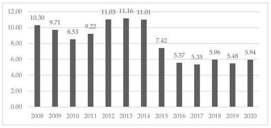 Figure 4 shows the percentage share of the sales value of EVOO-PDO in total revenues from the sale of PDO-certified agri-food products in Spain between 2008 and 2020. Up until 2015, the olive oil industry was responsible for more than 10% of all revenues from the sale of PDO-certified agri-food products. However, between 2015 and 2020, many types of agri-food products registered significant increases in sales as a result of a greater commitment to differential quality and consumers’ growing interest in this type of food. Examples include PDO-certified ham, fruit, and fish and molluscs, which registered increases in sales revenues of 29.68%, 121.97%, and 58.57%, respectively, between 2015 and 2020. In comparison, revenues from EVOO-PDO rose by 6.46%, with this increase being below the average for the whole sector (SV Agrifood-PDO), which presented an increase of 32.89%. This trend coincides with what has been observed in the EU as a whole [47] and with the increase in the production and sale of PDO-certified fruit and vegetable products in Spain [64].