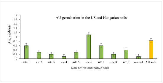 Higher germination was observed in A. ursinum soils; the second suitable soil was considered under M. uniflora, and the less suitable soil for germination was the C. pilosa soil. The American soils also showed significant differences when compared with the native Hungarian C. pilosa and M. uniflora soils (p-value < 0.001; Table 1); however, there were differences among American soils as well (Figure 1).