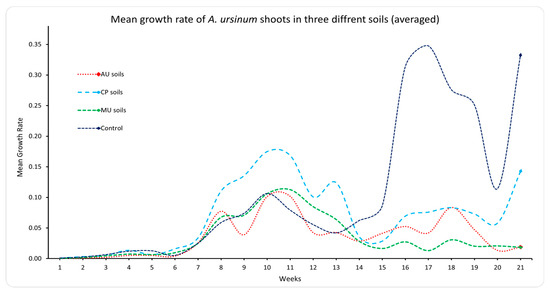 The mean growth rate of A. ursinum shoots for 21 weeks across different soil types. Legend: AU = A. ursinum; CP = C. pilosa; MU = M. uniflora.