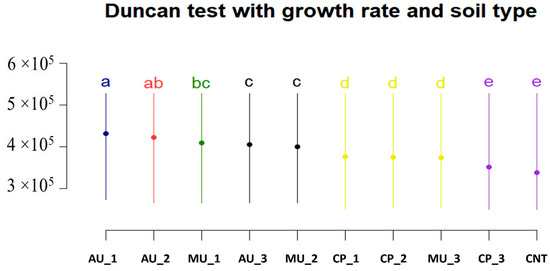 Duncan post hoc test for growth rate and soil origin type showing which soil origin had a similar effect on A. ursinum growth rate in response to total solar radiation, y-axis: quantile-normalised values of growth rate (order of magnitude similar to the values of the sum of solar radiation. Abbreviations: AU—A. ursinum; CP—C. pilosa; MU—M. uniflora; CNT—Control; 1/2/3—site name. Different letters (a, b, c, d, e) above the symbols refer to significant differences (p < 0.05) between the effect of soil origins on growth rates.