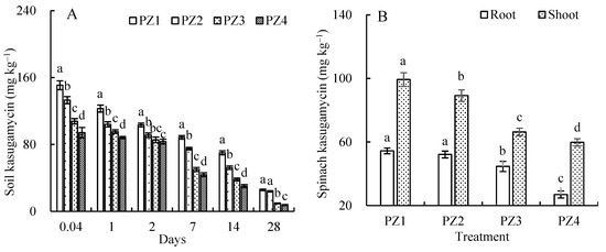 KSM concentrations in (A) soil (0–5 cm in depth) as a function of time and (B) spinach roots and shoots at the end of the study (28 days after KSM application). Treatment PZ1 = 100 mg box−1 (equivalent to (2 kg ha−1) was sprayed on spinach leaves in unamended soil; soil containing PZ2 = 20 mg Cd kg−1 added to an unamended soil surface, and 100 mg box−1 sprayed on spinach leaves; soil amended with PZ3 = 5% biochar (w:w), and 100 mg box−1 sprayed on spinach leaves; and soil containing PZ4 = 20 mg Cd kg−1 added to the surface of a soil amended with 5% biochar (w:w), and 100 mg box−1 sprayed on spinach leaves. Different lower-case letters above error bars (error bars: the standard deviation of the mean; n = 3; p < 0.05, determined via a Tukey post hoc test) indicate statistically significant differences between treatments.