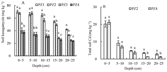 Soil KSM (A) and Cd (B) concentrations by soil depth at the end of the study (14 days after KSM application). Treatment PZ1 = 100 mg KSM box−1 (equivalent to (2 kg ha−1) was sprayed on spinach leaves in unamended soil; soil containing PZ2 = 20 mg Cd kg−1 added to an unamended soil surface, and 100 mg box−1 sprayed on spinach leaves; soil amended with PZ3 = 5% biochar (w:w), and 100 mg box−1 sprayed on spinach leaves; and soil containing PZ4 = 20 mg Cd kg−1 added to the surface of a soil amended with 5% biochar (w:w), and 100 mg box−1 sprayed on spinach leaves. Different lower-case letters above error bars (error bars: the standard deviation of the mean; n = 3; p < 0.05, determined via a Tukey post hoc test) indicate statistically significant differences between treatments within a particular depth.