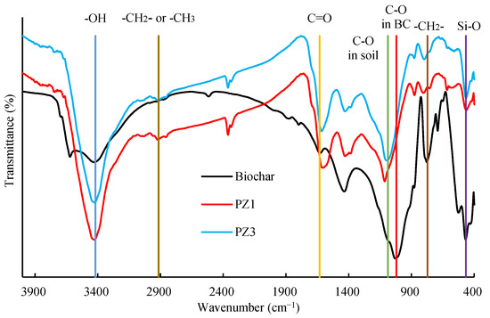 Functional groups of raw biochar and soils were detected by Fourier-transform infrared spectroscopy (FTIR, NEXUS-670, NICOLET, Waltham, MA, USA).