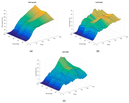 Three-dimensional plots of experimental data for (a) plant growth, (b) leaf length and (c) leaf width.