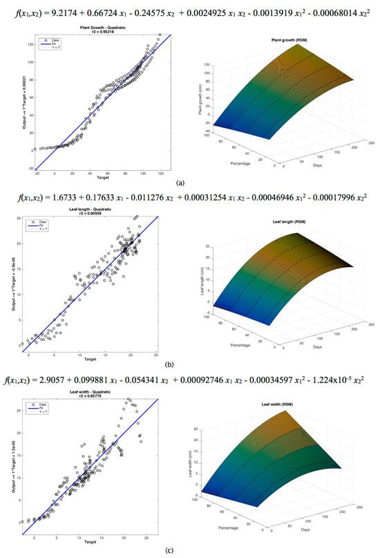 RSM plots with quadratic model fit and linear correlation for (a) plant growth, (b) leaf length and (c) leaf width.