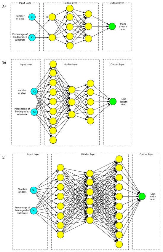 Finally, the ANN with the best performance (r2 = 0.99343, RMSE = 0.49074, MAPE = 4.588313%) to calculate the leaf width (Figure 4c) had an input layer with two neurons, three hidden layers with eight, six and 10 neurons for each one, and an output layer with one neuron representing the leaf width. The linear correlation of this ANN is shown in Figure 5c. It predicts the maximum leaf width at 27.49 cm, considering 100% of biodegraded substrate and 183 days after the germination of tomato seeds.