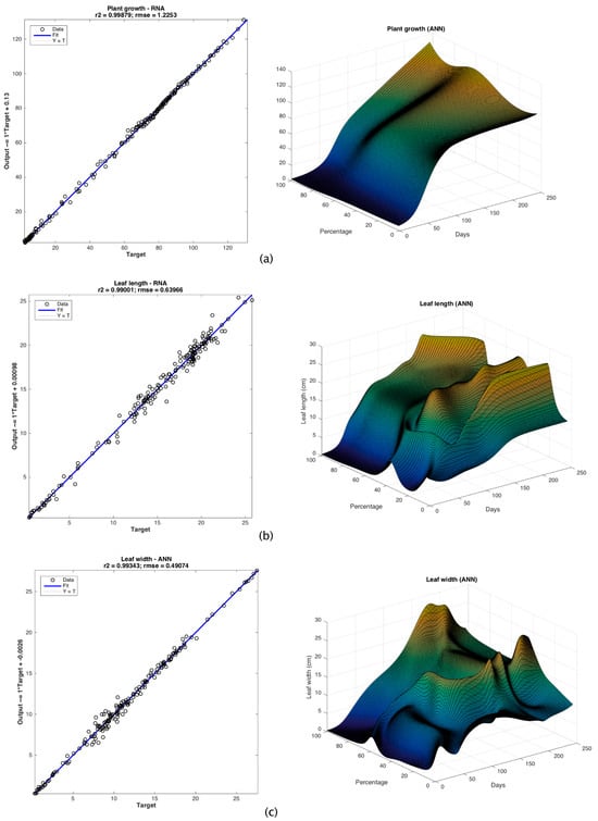 ANN plots and linear correlation for (a) plant growth, (b) leaf length and (c) leaf width.