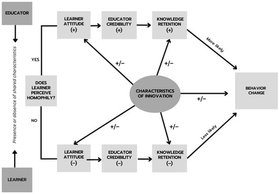 Moscarelli’s [21] model (Figure 2) builds on Rogers’ DOI theory. The model indicates that educator–learner homophily affects learners’ perceptions of the trainer’s credibility [5,6,7]. That perceived credibility then affects the learners’ attitudes, knowledge retention, and behavior change [8,10,11]. The Moscarelli model describes the learner’s attitude, knowledge retention, and behavior change as a function of educator–learner homophily in training and development settings; however, we recognize that trainees’ behavior change depends on innovation characteristics, as well.