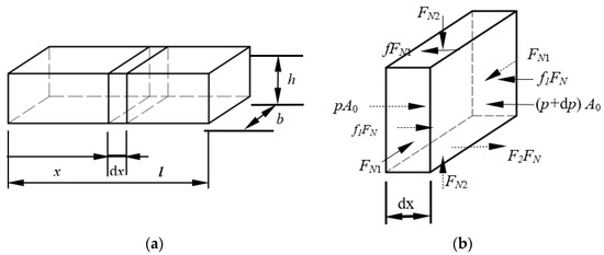 The principle of the frictional seeding method is illustrated in Figure 2. The group of granules in the rectangular tubular space (seeding area) in Figure 2a is taken as the study object, ignoring gravity. Since the granules are relatively small, they are viewed as a continuum with a rectangular cross section so as to simplify the analysis process. Then the microsegment dx of the granule group is taken as the study object, and the flow direction along the granules is set as positive. The force analysis of the microsegment dx is shown in Figure 2b. Three sides of the granules in the rectangular tubular space—the top, bottom and front—are subjected to friction to the left while the back is subjected to friction to the right and the right ends are subjected to the forces of other granules.