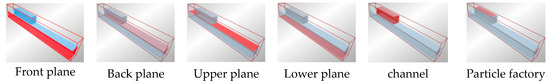 The geometry model for EDEM simulation is shown in Figure 4, including four independent planes: the front, the back, the top and the bottom. The upper plane is installed with a channel to assist the granules in entering the rectangular tubular space, and the particle factory is built on the virtual plane at the topmost part of the channel to generate 1000 particles per second at random positions on the factory plane, and the channel has a certain height to provide a certain initial pressure when the granules are stacked to fill the whole geometry; the front plane is L-shaped, and the right baffle makes the granules’ motion obstructed, which provides a certain resistance. The upper, lower and rear planes are added to the moving plane model with the velocity direction horizontal to the right and the velocity size being 3 m/s. The particle radii were taken as 2, 2.25, 2.5, 2.75, 3, 3.25, 3.5, 3.75 and 4 mm, while the friction coefficients between the particles and the geometry were taken as 0.1, 0.2, 0.3, 0.4, 0.5, 0.6, 0.7, 0.8 and 0.9, respectively. These parameters of each level were paired for full-factor simulation experiments. A total of 150 mm was taken from the right side of the rectangular space and divided into 10 segments, with 10 grid bin groups inserted. After the macro stability of the particles in the tube lasted 3 s, the average value of the granule group was recorded using the grid bin group. As the internal force chain structure of the granule group is related to its formation process and particle positions are made randomly by the particle factory, the process was repeated three times and only the average of the three data was used for statistical analysis.