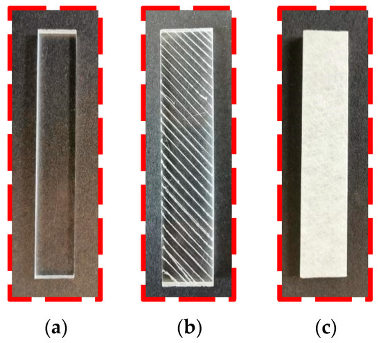 The experimental equipment is shown in Figure 5, including the bracket, sliding rail, slider, acrylic square tube, sensor, dynamic signal collector and laptop. Among these items, the acrylic square pipe was measured as follows: 1500 mm for the length of the bottom and back; 1470 mm for the length of the top; 25 mm for the width. When fixed together, it was installed on the slider and the slider could slide left and right on the side rail. After the 200 mm long front and 25 mm in wide slider was fixed on the bracket, 8 mm diameter round holes were drilled every 30 mm apart on its front from right to left, and a total of five circular holes were arranged for mounting the sensor probe for the installation of the sensor probe. The sensor was an XL1155-type resistance strain sensor produced by Qinhuangdao Xie’ll Technology Development Co., Ltd. (Qinhuangdao, China), with a sensitivity of 2 mV/V. It was fixed on the bracket with an 8 mm diameter probe and inserted into the square tube through the round hole on the acrylic square tube, which paralleled with the inner wall of the square tube for measuring the pressure of the particles inside the tube against the tube wall. The sensor was connected to the dynamic signal collector through the network cable, and the dynamic signal collector was a JM5937A-type dynamic signal collector produced by Yangzhou Jingming Technology Co., Ltd. (Yangzhou, China), with its sampling rate up to 100 KHz/CH. The collected signals were input into the laptop through USB2.0, and the data were analyzed using JMTEST dynamic signal testing and analysis software Ver8.2. In order to change the static friction coefficient with soybean seeds, the inner wall of the acrylic square tube was left untreated or treated with patterned paper or carved with patterns by a carving machine. The friction coefficients were 0.6, 0.7 and 0.8, respectively. The treated surface is shown in Figure 6. In order to make the experimental granules close to reality, Heihe43 soybean seeds were chosen for the experiment, and after the sorting machine sorted out the seeds with roundness within the range of 2~4 mm, a radius of 3.25 mm and 3.75 mm seeds were selected with the help of a perforated sieve as experimental materials. At the same time, in order to reduce the influence of vibration on the experimental results, the experiment involved using cold gel to bond the sensor to the experimental device to ensure that the force data from the sensor were more authentic.