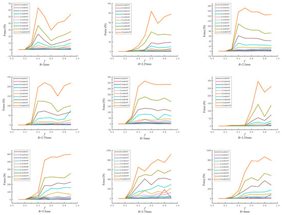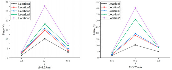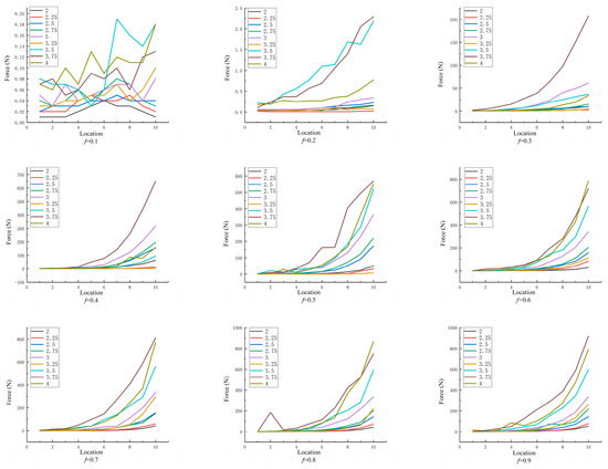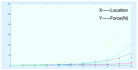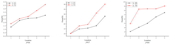 The data analysis graph is shown in Figure 7, Figure 8 and Figure 9, and the experimental results are shown in Table 2. By substituting the data in Table 2 into Formula (4), it can be concluded that the pressure of the particle on the side wall increases with the displacement as an E-exponent; the friction coefficient between the particle and the side wall increases with the e exponent when the friction coefficient is less than the interparticle friction coefficient, and tends to be constant when the friction coefficient is greater than or equal to the interparticle friction coefficient. When the ratio of the rectangle side length to the radius of the particle is , the pressure value of the particle on the side wall of the rectangle surges. Therefore, the correctness and practicability of the theoretical analysis can be verified. Figure 8 and Figure 9 show the influence of the three selected factors on the experiment according to the data results in Table 2. The line in the figure has no actual meaning. By observing the data points, the experimental results can be compared with a certain section of the simulation results, and the simulation results are basically consistent with the experimental results. The “Location” in the figure below indicates the location of the particle in the tubular space.