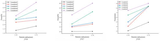 In order to avoid meaningless simulation experiments in which the radius of the particle and the edge length of the geometry section are changed at the same time and the experimental model scales up and down in equal proportions in the simulation process, the edge length of the geometry section and the particle radius were considered in the ratio of the geometry section’s edge length to particle radius d (referred to as the width-to-diameter ratio), as is shown in Figure 15. It can be seen that when the friction coefficient is 0.1, the particles cannot be effectively driven to fill the entire tubular space due to friction. Although the pressure on the particle increases with the particle radius, there is no obvious functional relationship between the two. When the friction coefficient is 0.2 to 1, the pressure on the granules increases when the width-to-diameter ratio reaches a certain value, and the analysis shows that the pressure increases at the point where the width-to-diameter ratio is (n + 2) to .