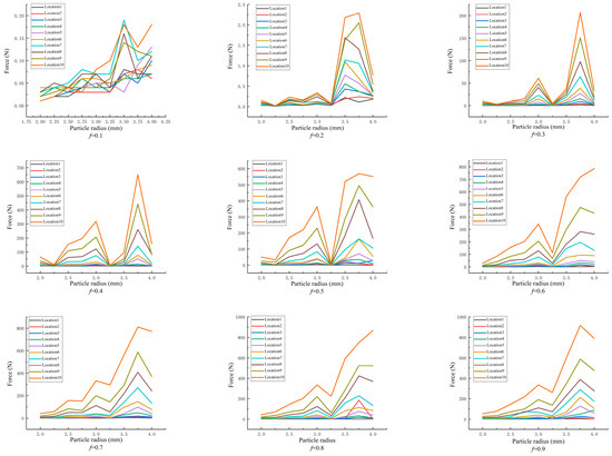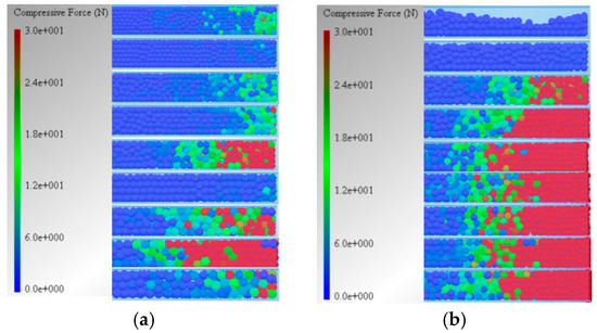 In order to present the simulation results visually, some screenshots of the simulation experiments were made with different particles under different forces rendered in different colors, and the results are shown in Figure 10. It can be seen that the location, the friction coefficient between the granules and the side wall, and the particle radius all have certain effects on the granules.