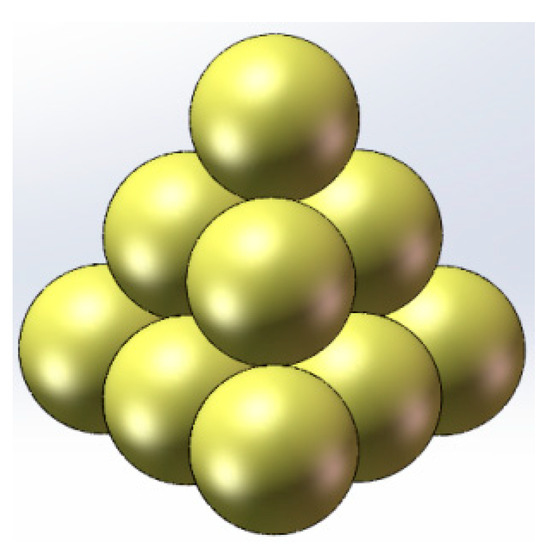 As in many studies, irregular particles in DEM simulation are usually modeled via the application of the multi-sphere method, as in the modeling of wheat seeds by Lai et al. [30]. However, in simulations, grain crop seeds like soybeans are seen as a typical bulk granule material and most of them are simplified to a spherical or nearly spherical shape [31]. In this paper, soybean seeds are simplified to a circular sphere in order to study the general laws of frictional seed-filling methods, to facilitate the research into the effect of the ratio of particle radius to rectangular tubular space side length on filling forces and to shorten simulation time. The shape of soybeans is approximately ellipsoidal, but the sphericity is high, with 90% of the particles being approximately spherical. Therefore, round spheres can be used to simulate the shape of soybean particles, as shown in Figure 3. While other characteristics are the same as in previous studies [32], the simulation parameters related to the particle body and geometry are shown in Table 1 [33].