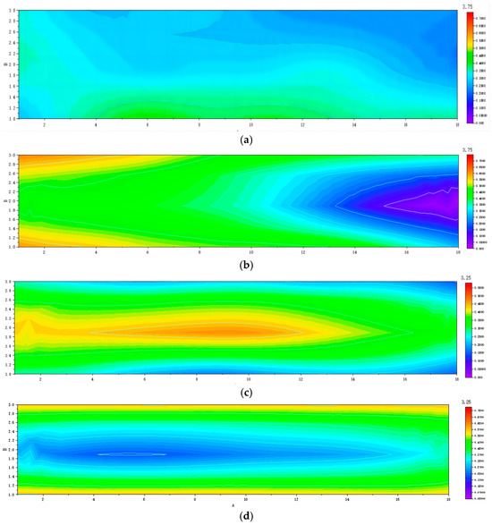 Distribution nephogram of particle porosity in tubular space. (a) When the particle radius is 3.75 mm, the distribution of particle porosity in tubular space is under stationary state. (b) When the particle radius is 3.75 mm, the distribution of particle porosity in tubular space is under moving state. (c) When the particle radius is 3.25 mm, the distribution of particle porosity in tubular space is under stationary state. (d) When the particle radius is 3.25 mm, the distribution of particle porosity in tubular space is under moving state.