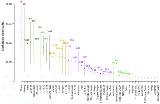 | Variety | Root Flesh Color | Root Skin Color | Proportion Medium | Proportion No. 1 | Proportion Jumbo | Marketable Yield (kg/ha) | Yield Significance Groups |