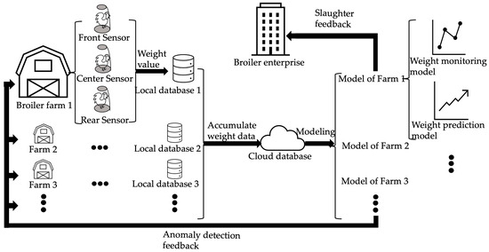The solution consists of two stages: non-invasive automatic real-time monitoring, and prediction of broiler weight. The first stage uses a multi-clustering machine learning algorithm to continuously eliminate outliers to obtain the average weight of a single individual. In the second stage, short- and long-term prediction models are flexibly established according to the feeding cycle to improve the prediction accuracy. An experimental study using 113 large datasets provided by Harim’s Cooperative Farms, the largest and leading broiler company in South Korea, demonstrated the practical feasibility of this approach. Figure 1 shows the general process framework, from data collection to model building, used in this study. It includes a hardware IoT system and a software algorithm system. The IoT system consists of three parts: an electronic scale fixed on the farm floor, a database that stores the local measurement data of the electronic scale, and a cloud database that aggregates all of the datasets. The software part constructs two types of models for monitoring and prediction based on the weight dataset (in terms of farms and feeding cycles) from the cloud database.