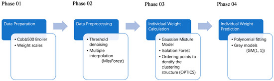 The objective of this study was to explore an automated and cost-effective method, based on machine learning algorithms, that uses weight sensors as the sole source of data collection to determine the live weight of individual broilers. To this end, several machine learning clustering algorithms were introduced to develop a methodology for processing and analyzing the data in three stages, allowing the average weight of an individual chicken to be derived from noisy and outlier data. Machine learning itself is a collection of algorithms that automatically learn and extract patterns and features from large amounts of data. It can be divided into supervised learning, which includes labels (i.e., positive solutions), unsupervised learning, which does not include labels, and reinforcement learning, which simulates maximizing cumulative utility, with unsupervised learning algorithms often used in data analysis and mining. The overall processing flow is shown in Figure 2 (Phases 2–4): In the first phase, all obvious outliers in the original data, including negative and 0 values, are replaced by data within the range of valid values. Here, we used the multiple interpolation machine learning algorithm. In subsequent stages, the entire dataset is divided into a number of monitoring units at fixed time intervals, and then the mean body weights of the individuals in each unit block are calculated using multiple clustering, anomaly detection, and other machine learning algorithms. In the third stage, the mean weight for the next time interval is predicted using the compiled list of individual weights.