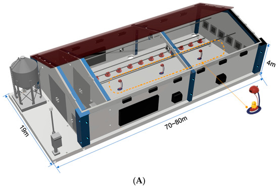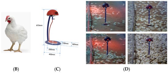 Laboratory space, equipment, and materials: (A) Scheme of the length, width, and height of the experimental farm and location of the three electronic scales; (B) Cobb 500 broiler; (C) KOKOFARM electronic scale; (D) farm environment during feeding operations.