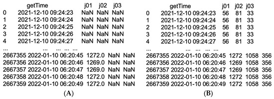 Raw data after preprocessing: (A) Noise reduction results based on critical values; (B) using MissForest to fill all null values.