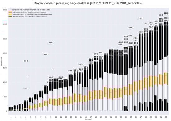 This study was conducted at 36 farms. A regular supply of Cobb 500 chicks was provided by the firm, and Cobb-Vantress, Inc. of Siloam Springs, AR, USA, was the output company. The breed’s minimum theoretical weight was 42 g (0 days of age), and the maximum weight was 4641 g (56 days of age). KOKOFARM electronic scales (model: KOKOFARM, provider: EMOTION Co., Ltd. of Jeonju, Korea, output company: CAS Co., Ltd. of Yangju, Korea) were used for precise measurements. We established and consistently calibrated monitoring systems at the front, middle, and rear locations of each farm before introducing a new group of breeders. Each scale was equipped with six types of sensors, including weight sensors, with a maximum range of 1500 g, a divisional value of 1 g, and a measurement error range of 5%. The breeding cycle on the farms lasts for 28 to 31 days, during which 30,000 broilers are raised in a single batch. The theoretical body weights of the broilers ranged from 42 to 2094 g based on the actual breeding cycle, and within this range the sample of broilers was representative. The sensors for body weight produced one reading per second, which was sent to the data server for storage in a CSV file format every minute of accumulation. The raw data, consisting of time and scale data, were obtained by filtering redundant sensor data and synchronizing timestamps with three weight values. The program was developed using Python 3.9, with core algorithmic libraries such as scikit-learn 1.1.2, SciPy 1.9.1, missingpy 0.2.0, and others being employed. All experiments were conducted on the server, which was equipped with an Intel (R) Xeon (R) Gold 5218R CPU operating at 2.10 GHz, an NVIDIA A100 80 GB PCIe, 251 GB RAM, and the Ubuntu Linux operating system. The experimental farm layout, broilers, and electronic scales are shown in Figure 3 below.