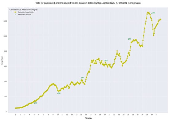 In the polynomial fit, the predicted values for day 15 were first fitted using the calculated weights for the first 14 days of age, each predicted value was compared to the actual calculated value for the next day, and the SMAPE value was calculated, and so on until the day of delivery. As shown in Figure 17 below, if the cumulative SMAPE value exceeded the set threshold, the model was refitted using all data prior to the current day of age.