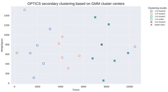 To screen the target values, we performed quadratic clustering of the above feature values based on the effective density (e.g., the electronic scale was restored from the perturbed state to the stationary state to obtain the effective measurement data). The range of feature data was significantly reduced after two iterations of the OPTICS process. Then, as shown in Figure 15 below, the datum with the highest weight among the feature values was selected as the target weight value.