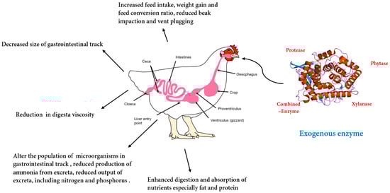 Benefits of exogenous enzymes on poultry health and digestibility.