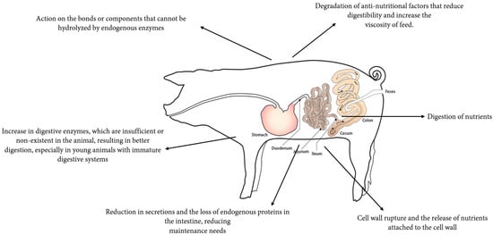 An enzyme cocktail (β-glucanase, xylanase and protease) improved the total tract digestibility of crude protein and ileal energy in pigs fed hull-less barley-based diets [84]. In addition, Yin et al. [82] reported that enzyme cocktail (arabinoxylanase and protease) dietary supplementation improved the nutritional value of diets containing wheat bran or rice bran in growing pigs. Moreover, weaned pigs’ growth performance and nutrient utilization were increased by dietary supplementation with enzyme cocktails that included proteases [83]. Though abovementioned studies showed beneficial effects, it is still unclear how much protease contributed to these enhancements. The exogenous enzymes and the mode of action on non-ruminant animals are presented in Figure 2. NSPs increase the viscosity of diets due to their capacity to bond to great amounts of water and to form a viscous gel, reducing the rate of substrate and digestive enzyme diffusion which provides a better litter quality.