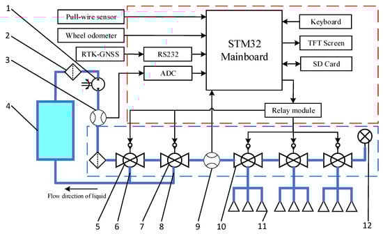 The hardware composition of the breakpoint continuous spraying system for boom sprayers is illustrated in Figure 1. The system mainly consisted of an STM32F407ZGT6 main control board, an RTK-GNSS, a wheel odometer, a spraying control valve group, a pump output flow rate sensor, a power pump, filters, and a pesticide tank. The STM32F407ZGT6 main control board (STMicroelectronics, Shanghai, China) served as the central control unit for the entire system. It contains an STM32F407ZGT6 single-chip microcomputer (SCM), an RS232 serial interface, two frequency inputs, buttons, one analog-to-digital converter (ADC) analog input, input/output (I/O) ports, a relay module, secure digital (SD) card storage, and a thin-film transistor (TFT) screen.