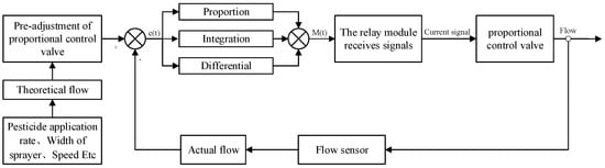 The flow control of the system uses a PID control algorithm, which pre-adjusts the opening degree of the proportional control valve to reduce the time lag in flow adjustment. First of all, the control valve opening was calibrated by resetting the control valve to a fixed initial position every time it is started, so as to ensure that the flow rate is adjusted from the same position every time. This is the process of adjusting to the initial position: the control valve to the maximum flow rate for 5 s is adjusted to ensure that the control valve has been opened to the maximum, and then it is adjusted in the opposite direction for 2 s. The opening degree of the proportional control valve was pre-adjusted by adjusting it to the opening degree closest to the target flow rate, based on the equation relating the opening degree and flow rate. Then, the actual flow rate detected within the pipeline was fed back to the controller via a flow sensor. The controller compares the actual and target flow rates and calculates the deviation signal between the two through PID calculations. This deviation signal was used to adjust the opening degree of the proportional control valve, ensuring a match between the actual and target flow rates, thus achieving closed-loop control of pesticide flow. The closed-loop control structure is illustrated in Figure 3. This method of flow rate adjustment offers advantages such as speed, stability, and accuracy [].