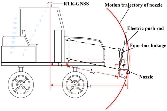 The RTK-GNSS was installed at the center of the sprayer roof, which was the located position. However, a certain distance exists between the positions of the RTK-GNSS and nozzles, and this distance changes with variations in the boom height. To establish the relationship between the RTK-GNSS and nozzle positions, the change in the length of the electric push rod was obtained through a pull-wire sensor and known lengths of the four-bar linkage. This information was then used to derive the distance relationship between the RTK-GNSS and nozzles. The structure is depicted in Figure 5.