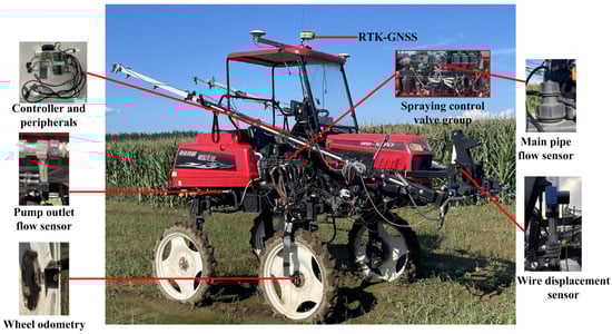 In the main grain-producing areas of China, land-intensive management practices have significantly reduced the workforce engaged in agricultural production. Consequently, ensuring high-quality grain production has become a major concern. Agricultural mechanization throughout the entire production helps produce high-quality grains. This is particularly true in the context of pesticide application, which requires high labor intensity and brings potential health hazards. Therefore, autonomous spraying equipment is increasingly gaining attention [,]. Unmanned autonomous sprayers involve various technologies, such as automatic guidance, precise dosage control, and autonomous control of the spraying boom. Automatic guidance is the foundation for unmanned agricultural machinery operations. It focuses mainly on environmental perception, position localization, and route planning, and it has already been applied in many aspects of agricultural machinery driving, including entry, turning, changing rows, and route planning [,,,]. The accuracy and update frequency of positioning under motion are essential for accurate agricultural machinery operations. The main data sources of guidance and positioning are obtained by fusing the information from multiple sensors, including satellite positioning systems, gyroscopes, and odometers [,,,]. Lee et al. [] developed a guidance and positioning module based on a wheel odometer and real-time kinematic global navigation satellite system (RTK-GNSS), fused the information from these sources using an extended Kalman filter algorithm, and proposed a method for constructing an odometer motion and GNSS sensor models. Their method significantly reduced the average positioning error by 46%. Jaime et al. [] presented a low-cost GPS-based autonomous positioning method, which combined GPS data with tractor motion control laws, and tested it by changing the GPS position in the tractor. The test results demonstrated an effective reduction in positioning errors. Li et al. [] introduced a fuzzy adaptive Kalman filtering algorithm for integrating position and attitude information and verified the algorithm through MATLAB simulations and experiments. The results showed that their algorithm could effectively suppress Gaussian white noise in GNSS reception signals and improve the positioning accuracy of agricultural machinery. Guo et al. [] designed a positioning system based on GPS and a gyroscope and established a model based on position–velocity–attitude. The experimental results showed a reduction in positioning error from 0.50 m to 0.30 m. Even in cases of GPS signal loss, their model could still provide accurate position information for up to 30 s. Most scholars use GNSS and sensor fusion to improve positioning accuracy. The positioning accuracy is the foundation of breakpoint continuation spraying, and only by improving the positioning accuracy can the identification accuracy of breakpoints be indirectly improved, thereby reducing the occurrence of repeated or missed spraying during the continuation process. As guidance systems continue to be widely adopted, automatic-guidance systems not only become more efficient but also ensure operational quality and assure farmers of increasing their income. Precise dosage control technology is essential for improving the quality of pesticide application [,,]. During the continuous spraying operation, precise control of the dosage is necessary to ensure that the dosage remains the same as the last interrupted spraying. The speed of adjustment is crucial for precise control of pesticide dosage. Only by ensuring fast and stable regulation can we effectively reduce the uneven application of pesticide and improve the utilization rate of pesticides. Xu et al. [] developed an improved genetic proportional–integral–derivative (PID) control algorithm (IGA-PID), which incorporated adaptive crossover and mutation operators with rapid convergence speed. Compared to standard algorithms, the IGA-PID achieved the lowest overshoot (1.25%), steady-state error (1.21%), and adjustment time (0.157 s). Sun et al. [] designed a variable-rate spraying system based on neural-network-tuned PID control. The system uses the autonomous learning ability of the neural network to adjust PID parameters, realizing precise control of the pesticide liquid loop. Test results showed that their system achieved an average adjustment time of 0.72 s and an average overshoot of 2.1%, with an actual dosage deviating by only 1.3% from the theoretical value. Spraying control valve groups have been widely adopted by many companies, such as TeeJet, Lechler, Ningbo Licheng Agricultural Spray Technology Co., Ltd., and Shandong Shahe Power Group Co., Ltd., owing to their reliable and stable operation characteristics. However, flow lag may occur during startup and shutdown owing to their inherent long flow adjustment time. Currently, automatic-guidance and speed-following dosage control have been applied in self-propelled sprayers. Nevertheless, the technologies for integrating guidance systems into the sprayer control system are not well accumulated, preventing complete automation in sprayer operations and especially hindering critical aspects, including breakpoint continuous spraying and uniform sprayings during turns. The meaning of “breakpoint” in “breakpoint continuation spraying” refers to the interrupted position of the last spraying for various reasons, and “continuation spraying” means continuing spraying at the interrupted “breakpoint” position of the last spraying. Breakpoint continuous spraying occurs when temporarily halting the pesticide spraying and recording the breakpoint position is necessary during adverse weather conditions, machine failures, or pesticide shortages. The position where the temporary halting of the pesticide spraying takes place due to the above situation is the breakpoint. It aims at facilitating the resumption of spraying fr