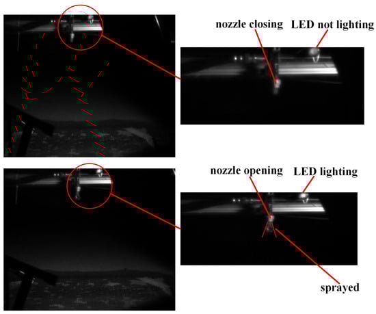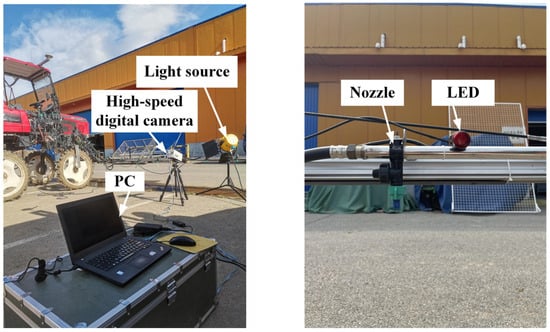 The delay in pesticide application caused by the switch valve control is one of the reasons for spray hysteresis. Compensation was performed by determining the time required by the switch valve to open until the nozzles start spraying and the droplets land at different flow rates. The spray hysteresis caused by the switch valve opening until the nozzles start spraying and the droplets land at different flow rates is compensated. Initially, various opening degrees of the proportional control valve were set to alter the total pipeline flow rate. The opening degree of the proportional control valve at which all nozzles started spraying under idle conditions of the spray engine was determined. The opening degree was stepwise reduced from 90% to 1%, and observations were made to determine whether all the nozzles sprayed fully. When all nozzles failed to spray completely, the opening degree of the proportional control valve was recorded. An opening degree of ≥87% ensured full spraying of all nozzles on the spray boom. Thus, the opening degrees of the proportional control valve were set to 100%, 95%, 94%, 93%, 90%, and 87%. A GigaView series GVMC08–B05 high-speed camera (Southern Vision Systems Inc., Huntsville, AL, USA) was used to record the time required by the switch valve to open until the nozzles started spraying and the droplets landed at different flow rates. During the experiment, an LED light was parallelly connected with the switch valve control relay. It illuminated when the nozzles started spraying. The entire process of light illumination until the droplets landed was recorded. The test bench for the high-speed imaging measurement of the nozzle opening time is shown in Figure 7.