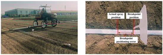 To validate the positioning accuracy of the fusion positioning and breakpoint identification algorithm, a comparative test was conducted between the RTK-GNSS + wheel odometer and the RTK-GNSS-only positionings. The test covers the following steps. First, the breakpoint position was set, colored label paper was placed 2 m before and after the breakpoint, and the breakpoint position was marked on the paper. Then, the sprayer approached the breakpoint position at speeds of 3, 4.5, and 6 km/h. Three repetitions were conducted for each speed. The distance from the red mark on the 5 cm wide colored label paper to the breakpoint was measured to compare the breakpoint identification accuracy.