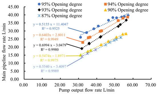 The throttle size of the sprayer corresponds linearly to the output flow rate of the pump, which can be altered by changing the throttle size. Thus, the opening degree of the proportional control valve was adjusted, and the relationship between the pump output and the main pipeline flow rates was recorded for each opening degree; the pump output flow rates were set to 31.10–57.30 L/min. The relationship between the pump output and the main pipeline flow rates was recorded for each setting, and the experiment was repeated three times for each group. During data analysis, the opening degree of the proportional control valve was considered a grouping criterion, and the relationship between the pump output and the main pipeline flow rates was obtained through linear fitting for each of the five opening degrees.