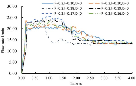 Moreover, for the tuning of PID parameters, first, KP was adjusted from 0.1 with increments of 0.1 in each iteration. Experimental results revealed that the system exhibited oscillations at KP = 0.4, but it remained stable for 0.2 < KP < 0.3. Thus, KP was determined as 0.24. After setting KP to 60% to 70% of its current value, KI was initialized at 0.1 and incremented by 0.05. Then, the response of the main pipeline flow rate was assessed. Based on these test results, as shown in Figure 8, oscillations were absent for KI < 0.2. After conducting tests at intervals of 0.01, KI was determined as 0.18, and, consequently, KP was fine-tuned to 0.20. Finally, KD was adjusted to 0.001. The parameters obtained after multiple trials can enable a fast response without oscillation. Through repeated testing, for optimizing the system response, the values of KP, KI, and KD were determined as 0.20, 0.18, and 0.001, respectively. The determination process of PID parameter KI when KD is 0 is illustrated in Figure 12.