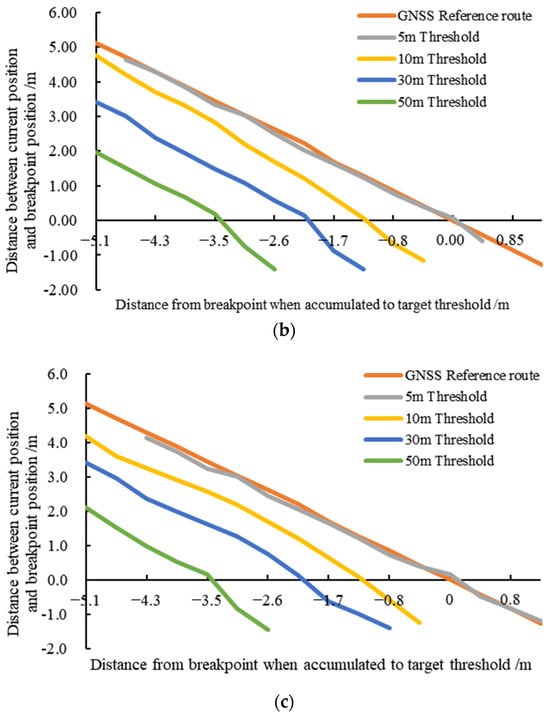 Figure 13 shows the breakpoint identification accuracy corresponding to the distance breakpoint thresholds recorded by the RTK-GNSS at speeds of 3, 4.5, and 6 km/h. Based on the test results, the minimum errors at speeds of 3, 4.5, and 6 km/h were 2.54, 7.22, and 15.07 cm, respectively. Across all speeds, as the threshold decreased, the error in breakpoint identification consistently decreased, with the minimum error at a threshold of 5 m. The maximum and average errors in breakpoint identification were 3.45 and 1.59 m, respectively, and the standard deviation was 1.15 m. Factors such as wheel deformation and uneven field terrain were responsible for an error between the odometer-recorded and actual mileages. This error accumulated as the recorded mileage increased, resulting in larger errors with greater recorded mileage and smaller errors with less mileage.